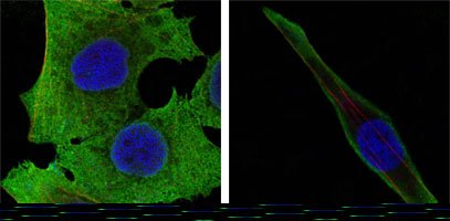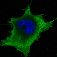 Figure 3: Confocal immunofluorescence analysis of 3T3-L1 cells using SOD1 mouse mAb (green). Blue: DRAQ5 fluorescent DNA dye. |