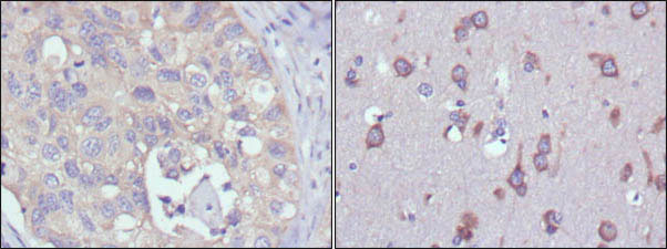 Figure 1: Immunohistochemical analysis of paraffin-embedded human lung cancer (left) and human brain (right) tissues using MPS1 mouse mAb with DAB staining.