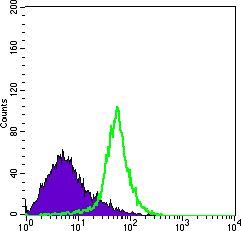 Figure 3: Flow cytometric analysis of Hela cells using ITGA5 mouse mAb (green) and negative control (purple). |