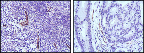 Figure 1: Immunohistochemical analysis of paraffin-embedded human lymph node (left) and colon cancer (right) tissues using eNOS mouse mAb with DAB staining.