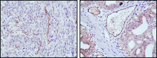 Figure 2: Immunohistochemical analysis of paraffin-embedded human stomach cancer (left) and ovary cancer (right) tissues using eNOS mouse mAb with DAB staining.