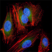 Figure 2: Immunofluorescence analysis of Hela cells using anti-MAP2K2 mAb (green). Red: Actin filaments have been labeled with DY-554 phalloidin. Blue: DRAQ5 fluorescent DNA dye. |