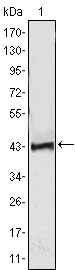 Figure 1: Western blot analysis using ATP2C1 mAb against human ATP2C1 (AA: 119-269) recombinant protein. (Expected MW is 41.7 kDa)