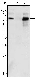 Figure 1: Western blot analysis using Androgen receptor mouse mAb against K562 (1), Jurkat (2) and LNCaP (3) cell lysate.