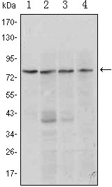 Figure 1: Western blot analysis using PRDM1 mouse mAb against Raji (1, 2), L1210 (3) and TPH-1 (4) cell lysate.