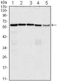 Figure 1: Western blot analysis using anti-CDC25C mAb against Hela (1), K562 (2), PC-3 (3), HEK293 (4) and Raw264.7 (5) cell lysate.