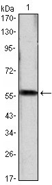 Figure 1: Western blot analysis using CCND1 mAb against CCND1(AA: 1-295)-hIgGFc transfected HEK293 cell lysate. |