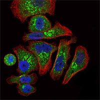 Figure 2: Immunofluorescence analysis of GC7901 cells using EPO mouse mAb (green). Blue: DRAQ5 fluorescent DNA dye. Red: Actin filaments have been labeled with Alexa Fluor-555 phalloidin. |