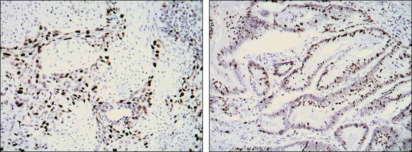 Figure 2: Immunohistochemical analysis of paraffin-embedded lung cancer (left) and rectal cancer (right) using KI67 mouse mAb with DAB staining. |
