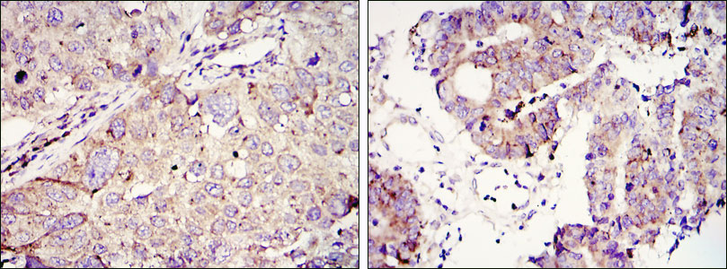 Figure 2: Immunohistochemical analysis of paraffin-embedded lung cancer (left) and colon tumour tissues (right) using IGC2BP3 mouse mAb with DAB staining. |