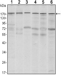 Figure 1: Western blot analysis using SETDB1 mouse mAb against MCF-7 (1),T47D (2), HEK293 (3), JURKAT (4), NIH/3T3 (5) and F9 (6) cell lysate. |