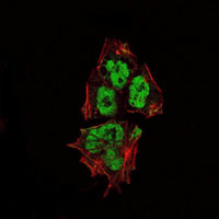 Figure 2: Immunofluorescence analysis of NTERA-2 cells using SOX2 mouse mAb (green). Red: Actin filaments have been labeled with Alexa Fluor-555 phalloidin.