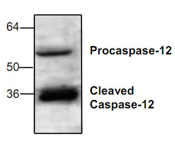 Three distinct signaling pathways lead to programmed cell death (apoptosis). The death receptor and mitochondrion pathways are the mains two pathways, in which the key apoptotic proteases caspase-8 and caspase-9, respectively, are involved. The endoplasmic reticulum (ER) stress is the third apoptotic pathway and caspase-12 is involved. Caspase-12 is located to the ER, but not to the cytoplasm or mitochondrion. Caspase-12 is activated by ER stress, including disruption of ER calcium hemeostasis, and mediates ER stress-induced apoptosis. Caspase-12 is localized to the ER with several proteins that are involved in Alzheimer’s disease including gamma-secretase presenilin and β-amyloid precursor protein (APP). Caspase-12 mediates cytotoxicity induced by amyloid-β. Caspase-12 is ubiquitously expressed in mouse tissues.