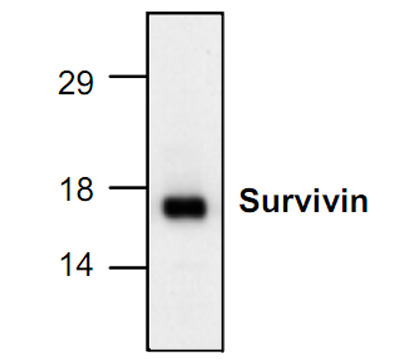 Survivin is a newly described apoptosis inhibitor that is expressed in many human cancers, but undetectable in terminally differentiated adult tissues. It has been shown that recombinant expression of Survivin conteracts apoptosis of B lymphocyte precursors deprived of interleukin 3 (IL-3), s μggesting a potential role of Survivin in cancer therapy. Survivin interacts with the processed form of caspase-3 and inhibits its proteolytic activity.