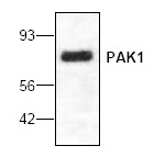 Human p21-GTPase-activated protein kinase 1 (PAK1) is a functional homolog of STE20 of Saccharomyces cerevisiae. PAK1 is a downstream effector of the Rho-family small GTPases Rac and Cdc42. A serine/threonine kinase, PAK1 induces the formation of filopodia and lamellipodia in Swiss 3T3 cells. PAK1 inhibits myosin light chain kinase, and appears to play a role in the regulation of apoptosis by phosphorylating the death agonist Bad. Membrane targeting of PAK1 induces neurite outgrowth. PAK1 may also regulate NFkB activation.