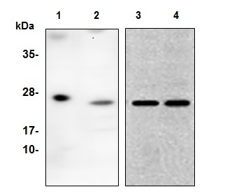 Western blot with human BCMA antibody: lane1.22ug mouse muscle lysate; lane2.60ug rat kidney lysate; lane3.50ug K562 lysate; lane4.50ug U937 lysate |