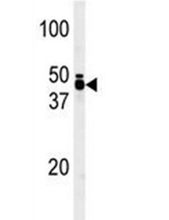 Western blot analysis of anti-TRIB1 pAb in T47D cell line lysate (35 ug/lane). TRIB1 was detected using the purified Pab. |