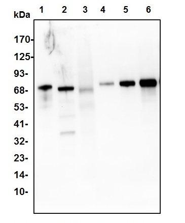 Western blot with human Transferrin antibody: lane1: human serum 0.2ug; lane2: mouse muscle lysate 33ug; lane3: rat kidney lysate 30ug; lane4: human Transferrin 2ng; lane5: human Transferrin 10ng; lane6: human Transferrin 50ng. |