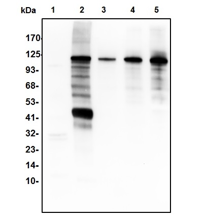 Western blot with human alpha2 Macroglobulin antibody: lane1: M.muscle lysate 33ug; lane2: human serum 1ug; lane3: Human alpha2 Macroglobulin 2ng; lane4: Human alpha2 Macroglobulin 10ng; lane5: Human alpha2 Macroglobulin 50ng. |