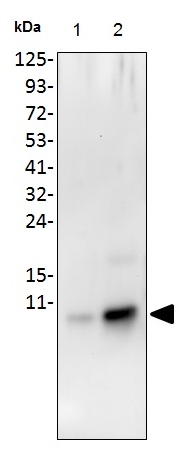 Western blot analysis of anti-RANTES with 10ng human RANTES: 1: 50ng human RANTES; 2: recombinant proteins RANTES. |