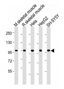 Western blot analysis in M.skeletal muscle lysate, R.skeletal muscle lysate, Hela cell lysates, HepG2 cell lysate and SH-SYY cell lysates.