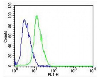 Overlay histogram showing SH-SY5Y cells stained with anti-LGR5 antibody(green). Isotype control antibody(blue) was rabbit IgG used under the same conditions. Acquisition of >10000 events was performed. |