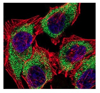 Fluorenscent confocal image of A549 cell stained with AGR2 Antibody (green). Cytoplasmic actin and Nuclei were stained in red and blue. AGR2 immunoreactivity is localized to Cytoplasm. |