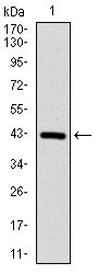 Figure 1: Western blot analysis using PPP1CB mAb against human PPP1CB (AA: 174-327) recombinant protein. (Expected MW is 43.2 kDa)