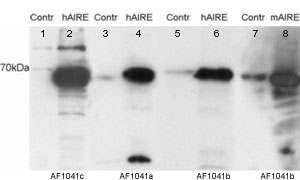 APG00016G staining (0.05 μg/ml) of HEK293 cell lysates. Untransfected (Lane 3) and transfected with Human AIRE (lane 4). Data kindly provided by Prof. P?rt Peterson, University of Tartu, Estonia.