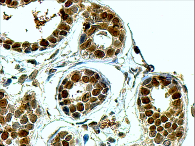 APG00029G (4 μg/ml) staining of paraffin embedded Human Breast. Steamed antigen retrieval with Tris/EDTA buffer pH 9, HRP-staining. |