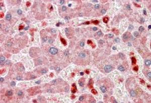 APG00040G (2.5 μg/ml) staining of paraffin embedded Human Liver. Steamed antigen retrieval with citrate buffer pH 6, AP-staining. |