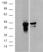 HEK293 overexpressing Aurora kinase A (RC212018) with C-terminal tag (DYKDDDDK) and probed with anti-DYKDDDDK in the left panel and with APG00042G in the right panel (vector-only transfection in first and fourth lanes). |