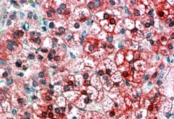 APG00043G (3.8 μg/ml) staining of paraffin embedded Human Adrenal Cortex. Steamed antigen retrieval with citrate buffer pH 6, AP-staining. |