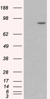 HEK293 overexpressing Human CTNNA1 (RC201766) and probed with APG00061G (mock transfection in first lane), tested by Origene.