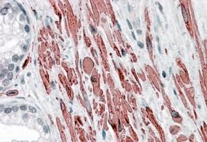 APG00087G (0.1 μg/ml) staining of Human Skeletal Muscle lysate (35 μg protein in RIPA buffer). Primary incubation was 1 hour. Detected by chemiluminescence.