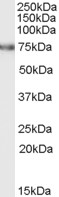 APG00120G (0.5 μg/ml) staining of rat kidney lysate (RIPA buffer, 35 μg total protein per lane). Primary incubated for 1 hour. Detected by western blot using chemiluminescence. |