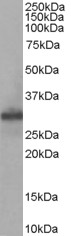 APG00125G staining (0.05 μg/ml) of Human Muscle lysate (RIPA buffer, 35 μg total protein per lane). Primary incubated for 1 hour. Detected by western blot using chemiluminescence.