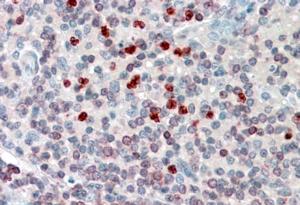 APG00129G (3.8 μg/ml) staining of paraffin embedded Human Spleen. Steamed antigen retrieval with citrate buffer pH 6, AP-staining. |