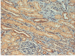 APG00131G (4 μg/ml) staining of paraffin embedded Human Kidney. Steamed antigen retrieval with citrate buffer pH 6, HRP-staining.