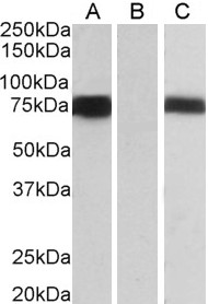 Western blot: In transfected HEK293 transiently expressing full-length Human FOXC1 (myc and DYKDDDDK tagged), a band of approx. 75kDa was observed. No bands were observed in mock-transfected and the same band was observed using anti-DYKDDDDK tag antibody. Recommended concentration, 0.5-1μg/ml. An anonymous customer found positive results in WB on Human breast cancer cells (T47D). IHC: In paraffin embedded Human Kidney shows nuclear staining in DCT and select nuclear staining in the glomerulus. Recommended concentration, 4-6μg/ml. Customer successfully used in IHC-P in mouse (periocular mesenchyme, cornea)