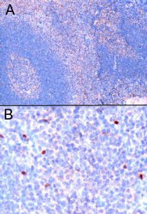 APG00136G (1 μg/ml) staining of paraffin embedded Human Tonsil. Microwaved antigen retrieval with Tris/EDTA buffer pH9, HRP-staining. A) Nuclear staining of scattered cells in the interfollicular area. B) High magnification of positive cells. |