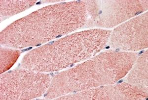 APG00149G (3.8 μg/ml) staining of paraffin embedded Human Skeletal Muscle. Steamed antigen retrieval with citrate buffer pH 6, AP-staining. |