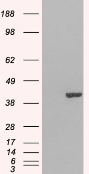 APG00152G staining (0.5 μg/ml) of Jurkat lysate (RIPA buffer, 30 μg total protein per lane). Primary incubated for 1 hour. Detected by western blot using chemiluminescence. |