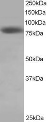 APG00156G staining (0.5 μg/ml) of Hela lysate (RIPA buffer, 35 μg total protein per lane). Primary incubated for 1 hour. Detected by western blot using chemiluminescence. |