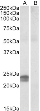 APG00158G (0.5 μg/ml) staining of Human Pancreas lysate (35 μg protein in RIPA buffer) with (B) and without (A) blocking with the immunising peptide. Primary incubation was 1 hour. Detected by chemiluminescence. |