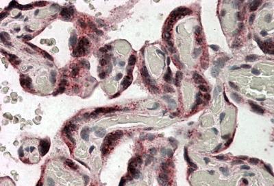 APG00165G (3.8 μg/ml) staining of paraffin embedded Human Placenta. Steamed antigen retrieval with citrate buffer pH 6, AP-staining. |