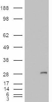 HEK293 overexpressing IGFBP6 (RC204060) and probed with APG00168G (mock transfection in first lane), tested by Origene. |