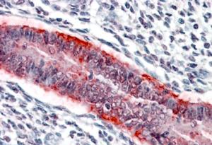 APG00202G (3.8 μg/ml) staining of paraffin embedded Human Uterus. Steamed antigen retrieval with citrate buffer pH 6, AP-staining. |