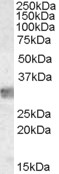APG00210G staining (0.03 μg/ml) of human thymus lysate (RIPA buffer, 35 μg total protein per lane). Primary incubated for 1 hour. Detected by western blot using chemiluminescence.