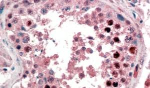 APG00211G (2 μg/ml) staining of paraffin embedded Human Testis. Steamed antigen retrieval with citrate buffer pH 6, AP-staining.